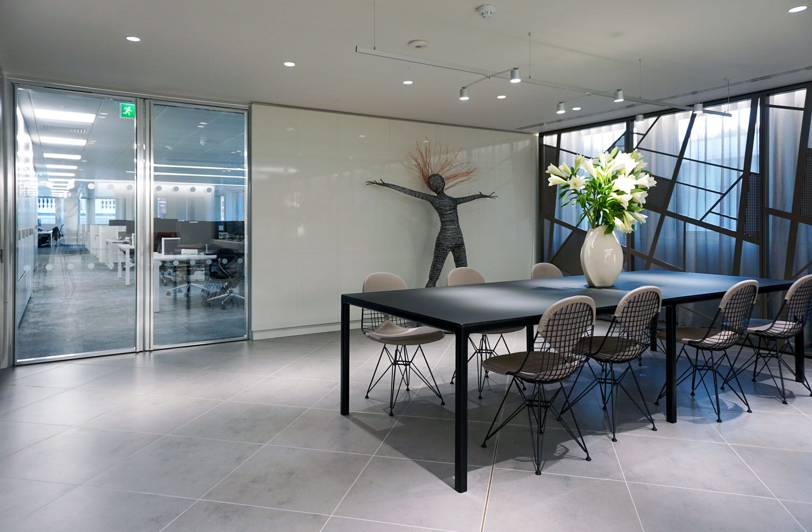 Partition system Vista with integrated drylining at the head and vertical abutments, leaving a very small retaining profile at the bottom to blend with the diagonal floor design pattern. Sliding doors feature Vista design of totally recessed fittings with integral handle. Polished aluminium finish to all visible parts for refined look and assimilation to other finishes.