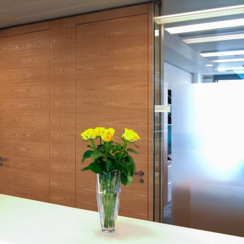 Description: Single glazed partition office fronts with Olive ash flush joinery door-sets